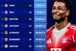 德甲進攻球員身價排名:奧利塞以1.3億歐位列榜首,凱恩7500萬歐緊隨其后。