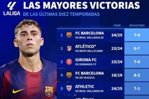 24直播網(wǎng)09月16日訊 西甲歷史最大比分勝場盤點中,巴薩5次上榜,包攬榜首。本賽季巴薩7-0巴拉多利德登頂,此前還曾8-2、7-1大勝對手。馬競、皇馬等隊亦有7-1的懸殊比分。