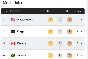 2、肯尼亞,2金0銀1銅,3塊獎牌