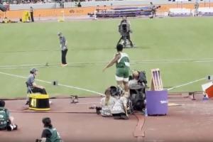 在鉛球快要落地時,這位裁判抬頭看了看。但已經沒時間做出躲避反應。還好鉛球沒砸他腦袋上,而是重重落在他腳面前的草地上,他嚇得往后一縮!