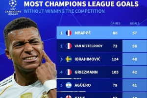 24直播網09月17日訊 德國轉會市場統計了未奪冠球員的歐冠進球榜。姆巴佩以88場57球高居榜首,范尼73場56球緊隨其后,伊布124場48球位列第三。該榜單展現了這些頂尖射手在歐冠賽場的穩定高效,盡管未曾捧起大耳朵杯,但他們用持續進球證明了自己的偉大。
