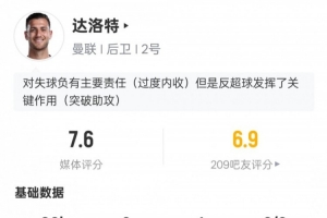 體育資訊8月31日訊 2025-26賽季英超第3輪,曼聯(lián)3-2險勝伯恩利。達(dá)洛特本場首發(fā)出戰(zhàn),貢獻(xiàn)1次助攻,送出2次關(guān)鍵傳球,還有3次過人成功以及2解圍2搶斷,但也有全場最多的23次丟失球權(quán),評分7.6。