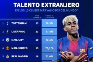 24直播網09月18日訊 根據德國轉會市場統計,身價前十俱樂部中外籍球員占比差異顯著。熱刺以79.3%的外援占比位居榜首,而巴薩以43.5%占比墊底。利物浦、曼城、曼聯等隊外籍球員比例也均超過七成,體現了歐洲頂級球隊高度依賴國際球員的趨勢。