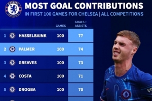24直播網09月18日訊 德轉統計切爾西球員百場參與進球數據,帕爾默以74球位列隊史第二,僅次于哈塞爾巴因克的77球。格里福斯、迭戈-科斯塔、德羅巴等名緊隨其后。