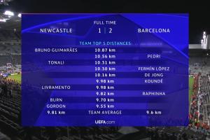 24直播網09月19日訊 歐冠首輪紐卡1-2惜敗巴薩。盡管紐卡球員包攬跑動榜前二(吉馬良斯10.87公里、托納利10.31公里),全隊平均跑動距離(9.81公里)也高于巴薩(9.6公里),但仍未能取勝。