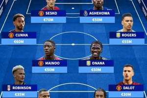 中場:庫尼亞(曼聯,6000萬歐)、梅努(曼聯,5000萬歐)、奧納納(維拉,5000萬歐)、羅杰斯(維拉,5500萬歐)