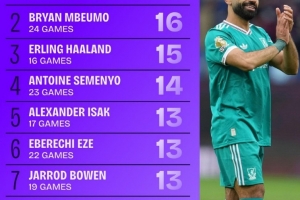 24直播網09月19日訊 根據Squawka數據,2025年英超參與進球榜(進球+助攻)中,薩拉赫以24場20球高居榜首。姆巴佩(24場16球)與哈蘭德(16場15球)分列二、三位。伊薩克、埃澤等球員也躋身前十,展現了英超的進攻火力。