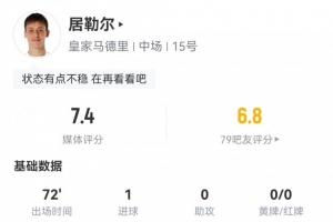 體育資訊8月31日訊 西甲第三輪,皇馬暫2-1領(lǐng)先馬洛卡。此役居勒爾首發(fā)72分鐘被換下,球員全場重點(diǎn)數(shù)據(jù)如下↓
