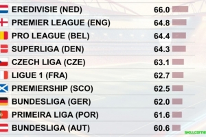 24直播網(wǎng)09月20日訊 根據(jù)CIES數(shù)據(jù),在球員平均高強(qiáng)度跑動(時速超20公里且持續(xù)超1秒)的聯(lián)賽排名中,荷甲以66.0位居榜首,英超以64.8次之,比甲(64.4)和丹麥超(64.3)分列三、四位。數(shù)據(jù)顯示,荷甲球員在高速跑動方面表現(xiàn)最為突出。