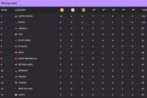 東京世錦賽官網(wǎng)更新名次得分表,奪得12金4銀4銅的美國以250分斷層領(lǐng)跑,6金2銀2銅的肯尼亞以103分排第2,2銀2銅的中國50分與埃塞俄比亞并列第5,東道主日本29分第14、韓國7分第43。