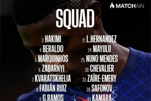 24直播網09月21日訊 巴黎明日客場挑戰馬賽,公布大名單。登貝萊等四人因傷缺席。門將為舍瓦利耶等三人;后防由阿什拉夫、馬爾基尼奧斯領銜;中場有法比安-魯伊斯、維蒂尼亞;鋒線則由克瓦拉茨赫利亞、拉莫斯等組成。