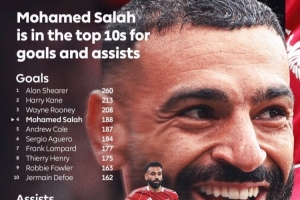 24直播網09月22日訊 英超官方提問薩拉赫能否達成200球+100助攻里程碑。目前,他以188球位列英超射手榜第4,89助攻助攻榜并列第5。若達成此成就,他將躋身英超歷史最偉大球員之列。