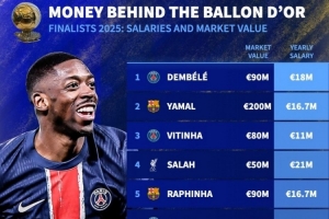 24直播網(wǎng)09月23日訊 德國轉(zhuǎn)會市場盤點了2025年金球獎前10球員的年薪。姆巴佩以3130萬歐高居榜首,登貝萊1800萬歐位列第二。榜單顯示,球星年薪與市場身價普遍呈正相關(guān),姆巴佩憑借其頂薪地位成為焦點。