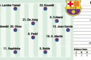 體育資訊8月31日訊 北京時間周一凌晨的西甲第3輪比賽,巴薩將前往客場挑戰巴列卡諾?!栋⑺箞蟆穼Ρ緢霰荣愂装l陣容進行了預測,庫巴西和杰拉德-馬丁搭檔中衛,萊萬、亞馬爾和拉菲尼亞組成進攻三叉戟,加維缺陣。