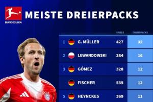 24直播網09月23日訊 德轉統計德甲歷史帽子戲法榜,蓋德·穆勒以32次斷層第一。凱恩表現驚艷,僅用67場便打入9次,追平迪特·穆勒與魯梅尼格,并列歷史第7,效率極高。