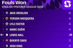 24直播網09月24日訊 英超第5輪數據出爐,埃弗頓的格拉利什以6次造犯規位列榜首,表現突出。狼隊的耶森-莫斯克拉等四名球員以4次并列第二,阿森納的薩卡等四名球員以3次緊隨其后。