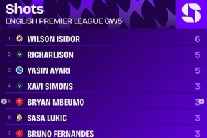 24直播網09月24日訊 英超第5輪數據公布,桑德蘭前鋒伊西多以6次射門高居榜首。熱刺的理查利森與布萊頓的亞辛-阿亞里以5次射門并列第二。哈維-西蒙斯、姆貝莫等8名球員以3次射門并列第四。