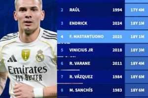 24直播網(wǎng)09月24日訊 在西甲皇馬4-1萊萬(wàn)特的比賽中,小將馬斯坦托諾破門,以18歲1個(gè)月的年齡成為隊(duì)史西甲聯(lián)賽第四年輕進(jìn)球者。他超越了恩德里克,僅次于傳奇球星里維拉(17歲3個(gè)月)和勞爾(17歲4個(gè)月),展現(xiàn)了皇馬青訓(xùn)營(yíng)的強(qiáng)大實(shí)力與未來(lái)希望。