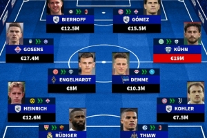 24直播網09月24日訊 德國轉會市場統計了球員轉戰意甲的最高身價陣容。該陣包括門將萊曼,后衛海因里希、呂迪格等,中場由戈森斯(2740萬歐,最高)、庫恩領銜,前鋒則有比埃爾霍夫與馬里奧-戈麥斯。