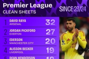 24直播網09月25日訊 英超2023-24賽季門將零封榜出爐。阿森納的拉亞以32場零封位居榜首,埃弗頓的皮克福德(27場)和曼城的埃德森(20場)分列二、三位。該榜單展現了各隊門神的出色表現。