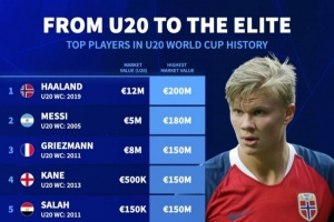 24直播網09月25日訊 2025年U20世界杯將啟,足壇新星嶄露頭角舞臺。“德轉”盤點了參賽后身價飆升的10大球星,包括哈蘭德、梅西、格列茲曼等。他們參賽時身價從15萬到1800萬歐元不等,生涯最高身價飆升至1.8億歐元,U20世界杯成巨星成名搖籃。