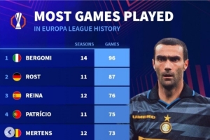 24直播網(wǎng)09月25日訊 德轉(zhuǎn)統(tǒng)計歐聯(lián)杯歷史球員出場數(shù)據(jù),貝爾戈米以96場位居榜首,成為出場王。雷納與曾加也躋身前十,分列第三和第七位。