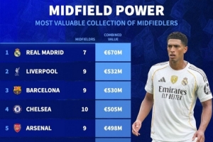 24直播網(wǎng)09月25日訊 德轉(zhuǎn)統(tǒng)計各隊中場總身價,皇馬以7名球員總價6.7億歐高居榜首。利物浦、巴薩分列二、三位,身價均超5億歐。切爾西、阿森納等豪門緊隨其后,展現(xiàn)了當(dāng)今足壇頂級聯(lián)賽中場的強(qiáng)大實力與市場價值。