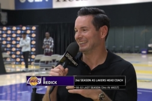 24直播網(wǎng)09月26日訊 湖人主帥雷迪克稱尚未與詹姆斯打高爾夫,因雙方日程繁忙。他稱贊詹姆斯之子布朗尼的揮桿流暢,認為他天生是運動好手,未來會是很棒的高爾夫球手。