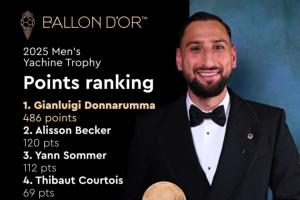 24直播網(wǎng)09月27日訊 2025年雅辛獎排名公布,意大利門將多納魯馬以486分斷層領(lǐng)先,力壓第二的阿利森(120分)和第三的索默(112分)。庫爾圖瓦、布努等知名門將分列其后。