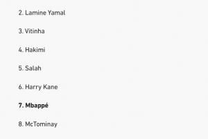 24直播網(wǎng)09月27日訊 韓國(guó)記者金球獎(jiǎng)投票揭曉:登貝萊、亞馬爾、維蒂尼亞分列前三,姆巴佩排第七,佩德里未進(jìn)前十。