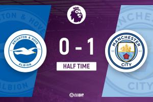 上半場傷停補時3分鐘,半場結束,曼城暫1-0布萊頓。