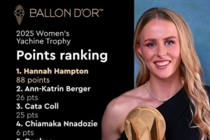 24直播網09月28日訊 《法國足球》公布2025年首屆女足雅辛獎,英格蘭切爾西門將漢普頓以壓倒性優勢奪冠。她獲得88分,遠超第二名貝格爾的26分。在50名評委中,47位將她選入前二,41位將其列為第一,彰顯其統治級表現。