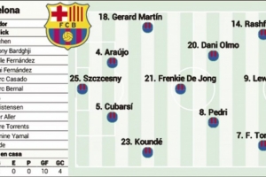 在邊路,一切跡象表明孔德和馬丁將會首發,而巴爾德則蓄勢待發,等待獲得一些出場時間。與巴爾德情況類似的是亞馬爾,他將在缺席一個月后于本周回歸。原則上,在拉菲尼亞缺陣后,弗里克開局將押注于由拉什福德、萊萬多夫斯基和費蘭-托雷斯組成的鋒線三叉戟。