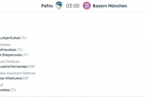 24直播網09月28日訊 拜仁歐冠客戰帕福斯的裁判組公布。主裁為立陶宛的盧克揚丘卡斯,其三名助理裁判及第四官員也均來自立陶宛。視頻裁判(VAR)及助理視頻裁判(AVAR)則由西班牙的費爾南德斯和比利亞努埃瓦擔任。