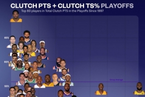 24直播網09月29日訊 NBA University統計了1997年以來季后賽關鍵得分前60球員的真實命中率。詹姆斯得分總量遙遙領先,效率略低于平均;霍里效率高居第一,但得分總量僅入圍。