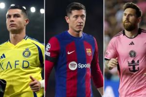 目前在現役球員射手榜上,C羅946球第一,梅西884球第二,萊萬700球排在第三。