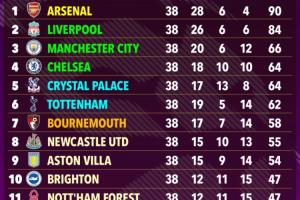 24直播網(wǎng)09月29日訊 超級計算機預(yù)測英超最終排名:阿森納90分奪冠,利物浦84分第二,曼城、切爾西緊隨其后。令人意外的是,曼聯(lián)僅位列第15。