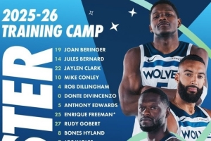 24直播網09月29日訊 森林狼官方公布新賽季訓練營大名單,共21名球員。名單包括核心球員如戈貝爾、愛德華茲、麥克丹尼爾斯和康利等,也涵蓋新秀與老將。球隊已為新賽季做好人員準備。