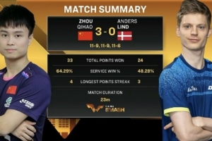 體育資訊9月30日訊 WTT中國大滿貫男單1/16決賽,國乒選手周啟豪3-0戰勝林德,晉級16強!