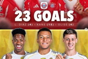 24直播網09月30日訊 Score90盤點五大聯賽球隊三人組進球數:拜仁三將(凱恩、迪亞斯、奧利塞)以23球居首,皇馬(姆巴佩等)16球次之,法蘭克福14球、曼城12球、巴薩11球、馬競10球分列其后。