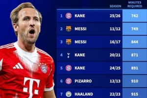 本賽季開局,凱恩僅用742分鐘時間就為拜仁造了20個進球(進球+助攻),比2011年的梅西快了7分鐘,刷新歷史。