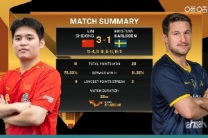 體育資訊10月2日訊 2025年WTT中國大滿貫男單1/8決賽,林詩棟3-1克里斯蒂安-卡爾森,晉級八強。