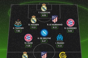 24直播網10月02日訊 歐冠第二輪最佳陣容出爐。庫爾圖瓦鎮守龍門,后防由特里皮爾、赫伊森等人組成。中場方面,奧利塞與德布勞內領銜。鋒線上,姆巴佩與阿爾瓦雷斯聯袂入選,海于格在列。