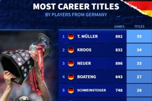 24直播網10月02日訊 德國轉會市場統計了德國球員的冠軍數量。穆勒以35冠高居榜首,克羅斯以34冠緊隨其后。諾伊爾、博阿滕、施魏因斯泰格等名將也位列榜單,展現了德國足壇的輝煌成就。