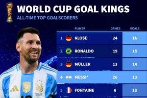24直播網(wǎng)10月04日訊 2026年世界杯用球“三重浪”已發(fā)布。歷史射手榜中,克洛澤以16球居首,羅納爾多、蓋德-穆勒緊隨其后。現(xiàn)役球員梅西(26場13球)和姆巴佩(14場12球)均躋身前十,展現(xiàn)強(qiáng)大統(tǒng)治力。
