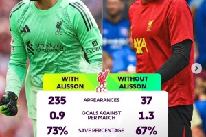 24直播網10月04日訊 英超利物浦將戰切爾西,主力門將阿利森傷缺,瑪瑪達什維利或臨危受命。數據顯示,阿利森缺陣時,利物浦場均丟球增至1.3球,撲救成功率降至67%,雖場均積分略高,但贏球率從66%下滑至73%,防線穩定性明顯下降。