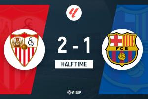 上半場傷停補時6分鐘,半場結束,巴薩暫1-2塞維利亞。