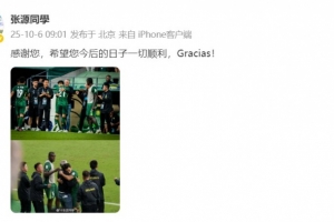 24直播網10月06日訊 北京國安官方宣布主帥塞蒂恩離任。球員張源發微博擁抱照片感謝并祝福主帥。國安目前中超排名第4,亞冠兩戰皆墨墊底。張源本賽季出場16次,貢獻2球4助。