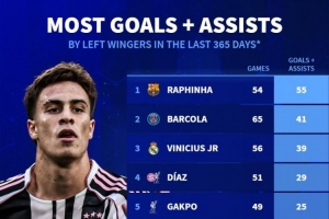 24直播網10月06日訊 德國轉會市場統計五大聯賽左邊鋒過去一年參與進球數,拉菲尼亞以54場55球居首,伊爾迪茲52場24球排名第6。值得注意的是,伊爾迪茲的德轉身價將在明天更新。