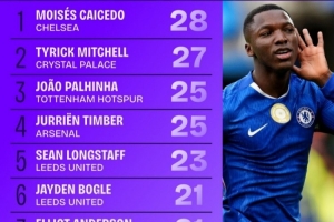 24直播網(wǎng)10月07日訊 根據(jù)Squawka統(tǒng)計,切爾西中場凱塞多以28次搶斷位居本賽季英超搶斷榜榜首。水晶宮的米切爾以27次位列第二,熱刺的帕利尼亞與阿森納的廷伯同以25次并列第四。